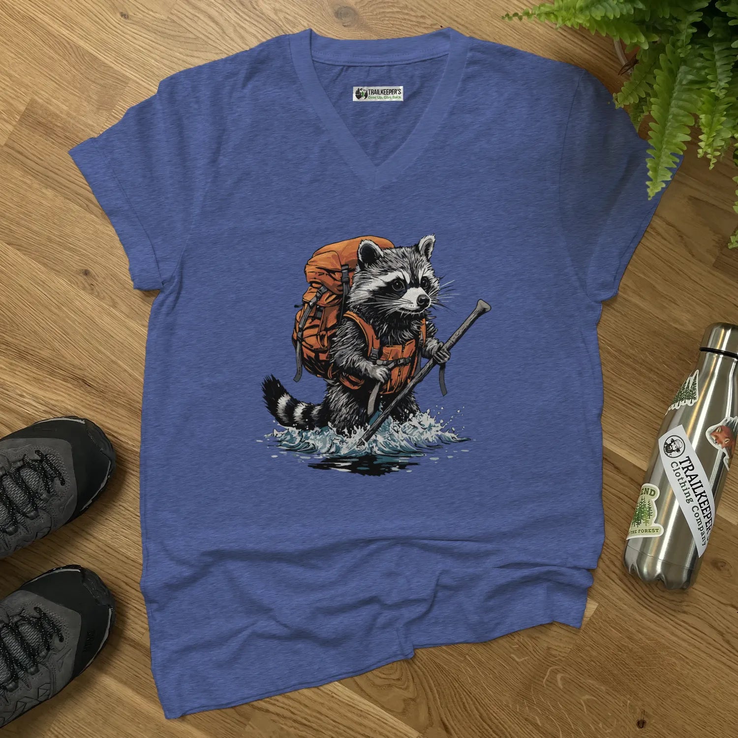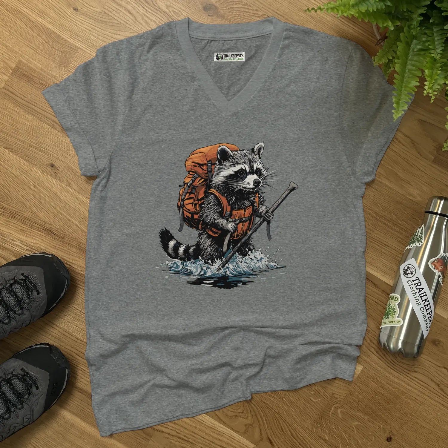 Raccoon Backpacker Fording River V-Neck T-Shirt
